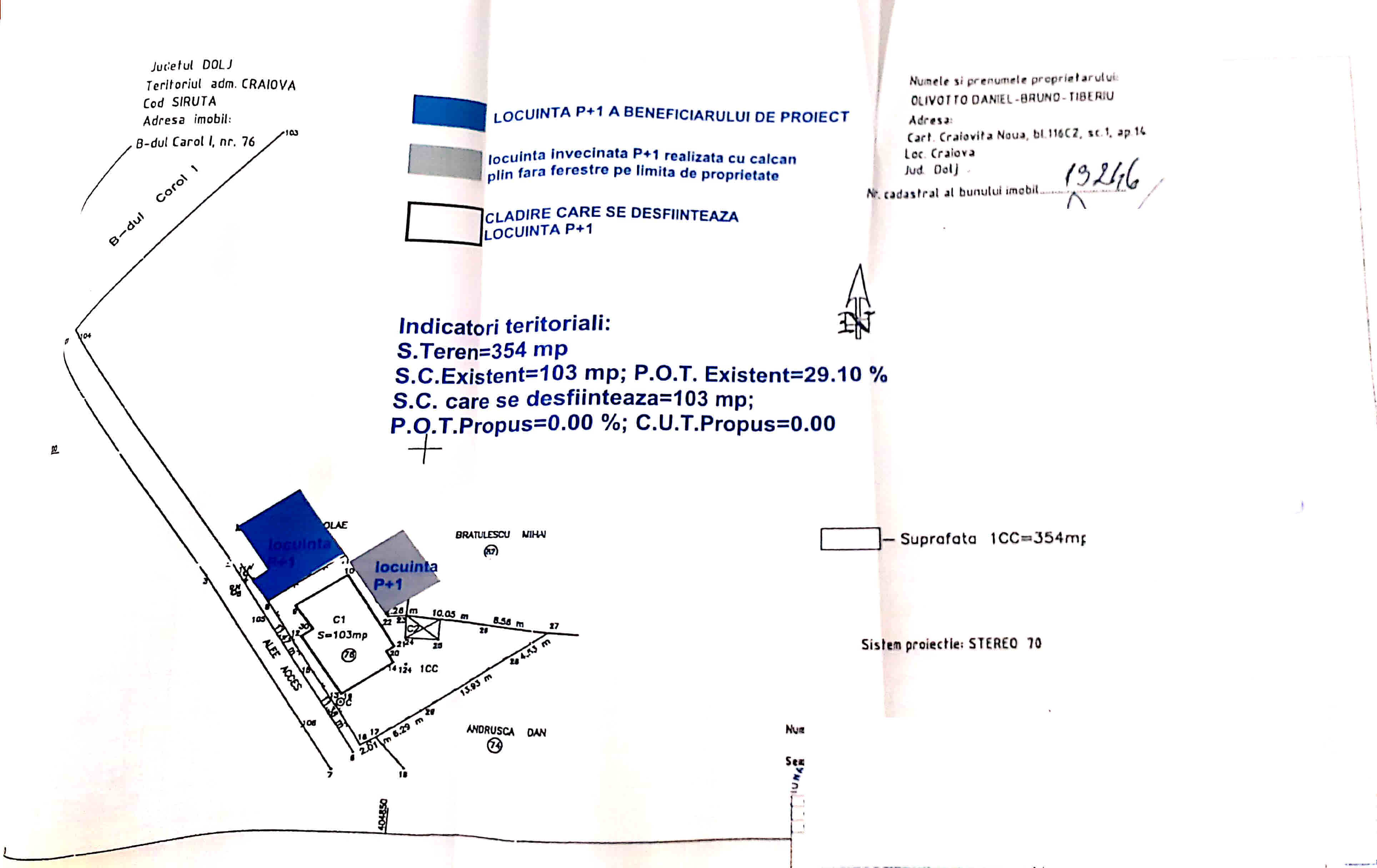 S teren=354 mp, Sc existent=103 mp, Scd=206 mp, POT existent=29,10%, POT propus=0,00%, CUT propus=0,00