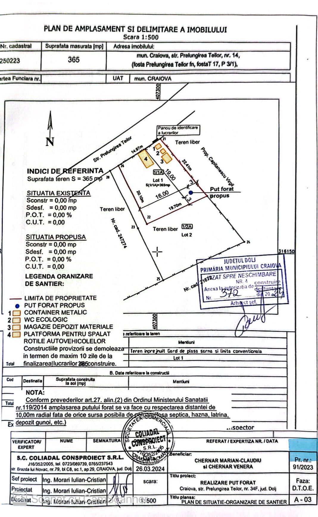-în baza documentaţiei tehnice - D.T. pentru autorizarea executări lucrărilor de construire (D.T.A.C. + D.T.O.E.), respectiv desfiinţarea construcţiilor (D.T.A.D.) nr. 91/2023 din , a fost elaborată de S.C. COLIADAL CONS PROIECT SRL , DOLJ , Municipiul CRAIOVA , satul - , sectorul - , cod poştal - Cartier Brazda lui Novac , nr. 79 , bl. C8 , sc. - , et - , ap. - , respectiv de ING.MORARI IULIAN -arhitect/conductor arhitect cu drept de semnătură, înscris în Tabloul Naţional al Arhitecţilor cu nr .-, în conformitate cu prevederile Legii nr. 184/2001 privind organizarea şi exercitarea profesiei de arhitect, republicată, aflat în evidenţa Filialei teritoriale - a Ordinului Arhitecţilor din România. FP-40-03, ver 01